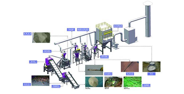 La línea de reciclaje de placas PCB incluye las siguientes máquinas: desfibradora, granulador, máquina de clasificación, máquina de separación, colector de polvo, equipos de purificación de escapes y el panel de control. Las máquinas principales se conectan a la cinta transportadora, al cargador de tornillo o al equipo soplador.